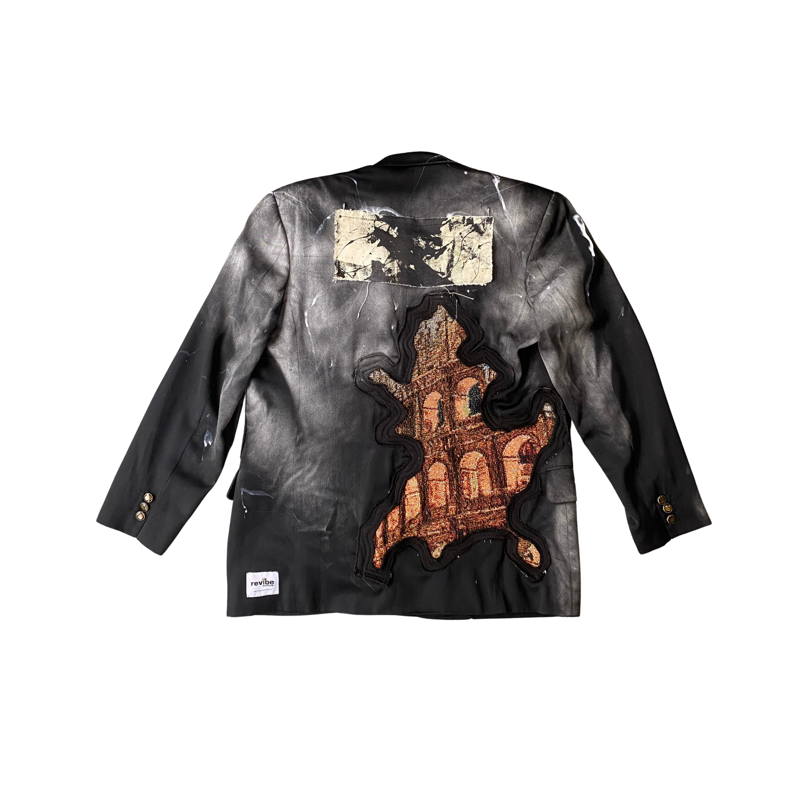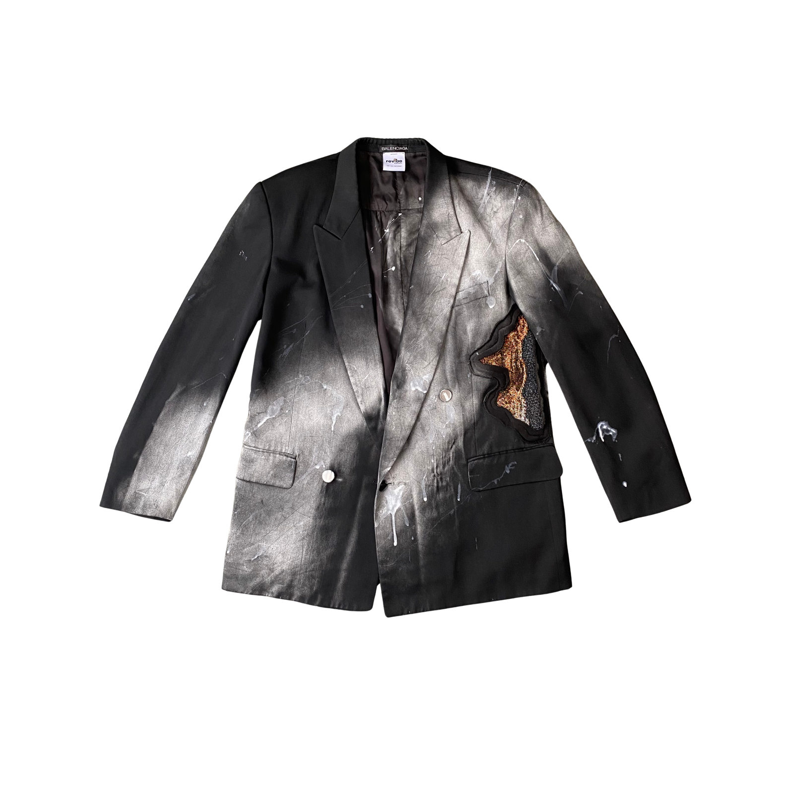 Balenciaga blazer is reworked into a powerful commentary on decay and transformation. A hand-painted, deconstructed canvas by 0270501 interrupts the blazer’s tailored form. A stroke of silver paint runs down the center of the blazer, slicing through structure with metallic contrast